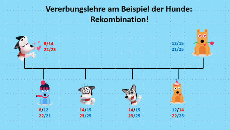 Und daher können natürlich auch andere Rassen bestimmt werden, wenn z.B. der Vater das für einen Pudel typische Merkmal an den einen und das Dackel-typische Merkmal an den anderen Nachwuchs vererbt.