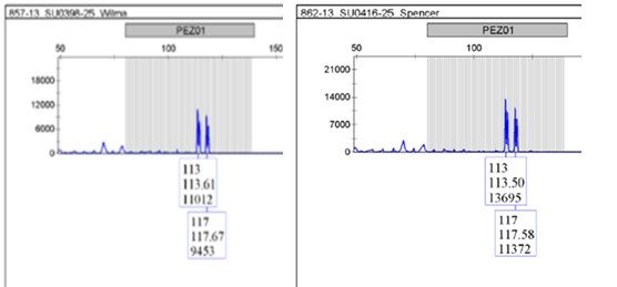 Nehmen wir den Genort PEZ5. Er hat neun typische Merkmalsmöglichkeiten und ist spezifisch für die Familie der Canidae. D.h., wenn wir hier ein Signal bekommen, ist klar, dass in der Probe DNA eines Canidae sein muss. Welcher genau, Wolf, Dackel oder Fuchs, wissen wir noch nicht.
